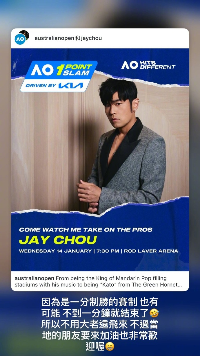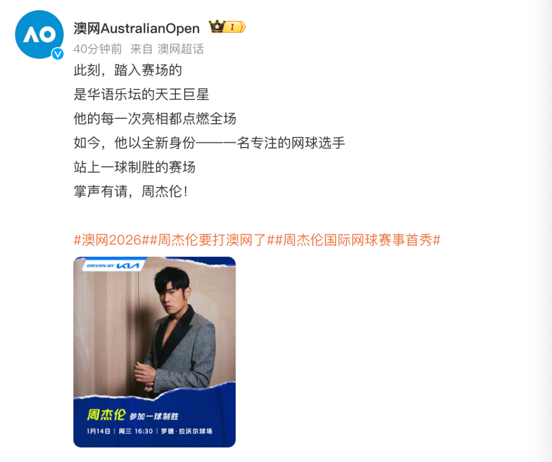 北京时间1月12日,澳网官方宣布:周杰伦将参加2026年澳网“一球制胜”,这也将是周杰伦的国际网球赛事首秀。